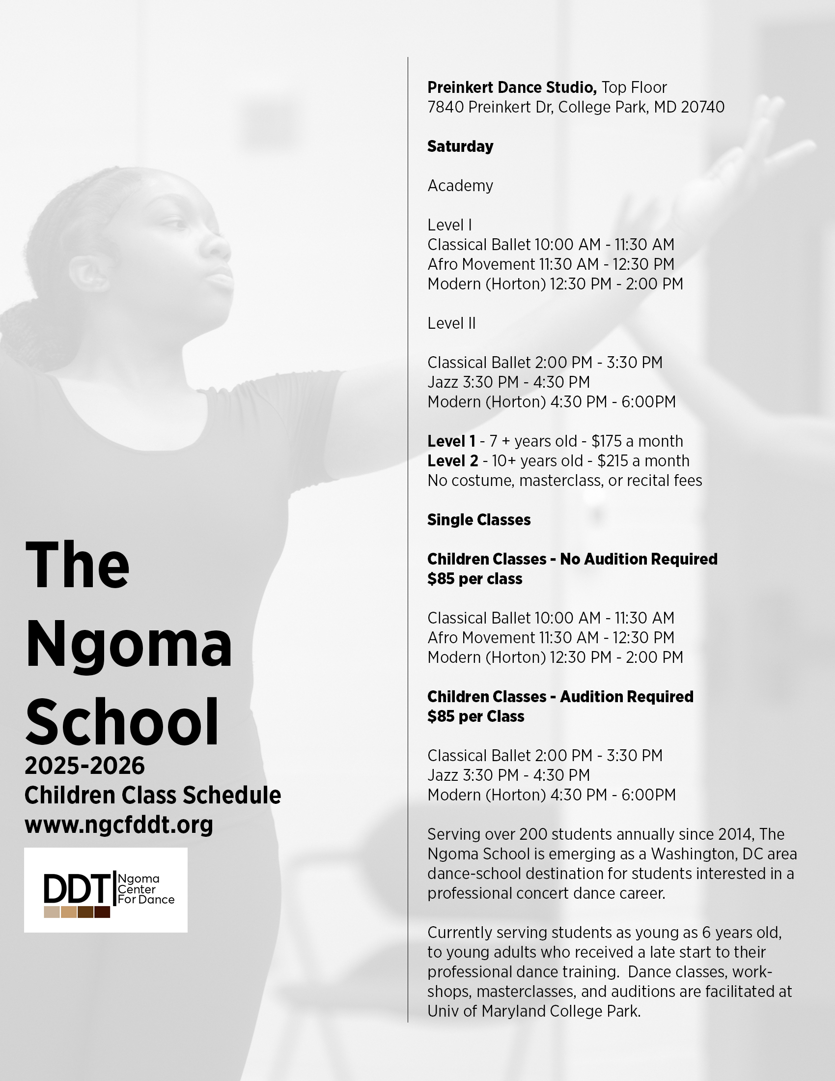 Every donation aids us in providing equity and access to many artists and families of varying backgrounds. Ngoma Center for Dance provides many programs and opportunities through the support of our generous funders, whom -without them – many artists (especially of color) would not have reached their dance dreams. DDT alumni have traveled forward to companies such as Momix, Virginia Ballet Theatre, Philadanco, Garth Fagan, Carolyn Dorfman Dance, UniverSoul Circus, Phoenix Dance Theatre (U.K.), and more…